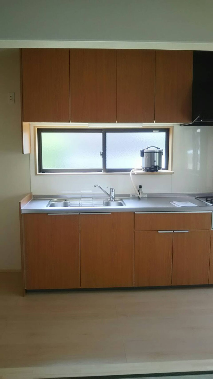 窓サッシ、壁紙、キッチンパネル張り、天井、床の張替によりスッキリ明るいキッチンに生まれ変わりました。